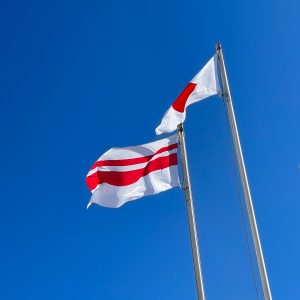 小学校に着くと、青空にはためく国旗。